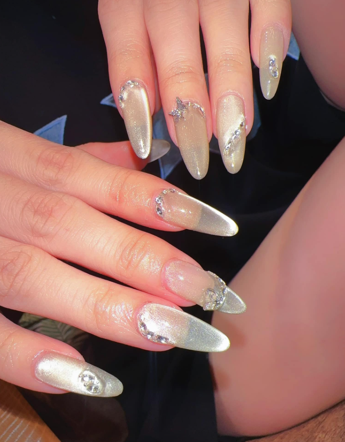 Chúng tôi không ngần ngại kết hợp giữa sơn thạch trong trẻo, nhũ kim tuyến lấp lánh và bột tráng gương (chrome) để tạo ra những hiệu ứng thị giác đa chiều, giúp bộ móng có sức sống và chiều sâu hơn bao giờ hết.