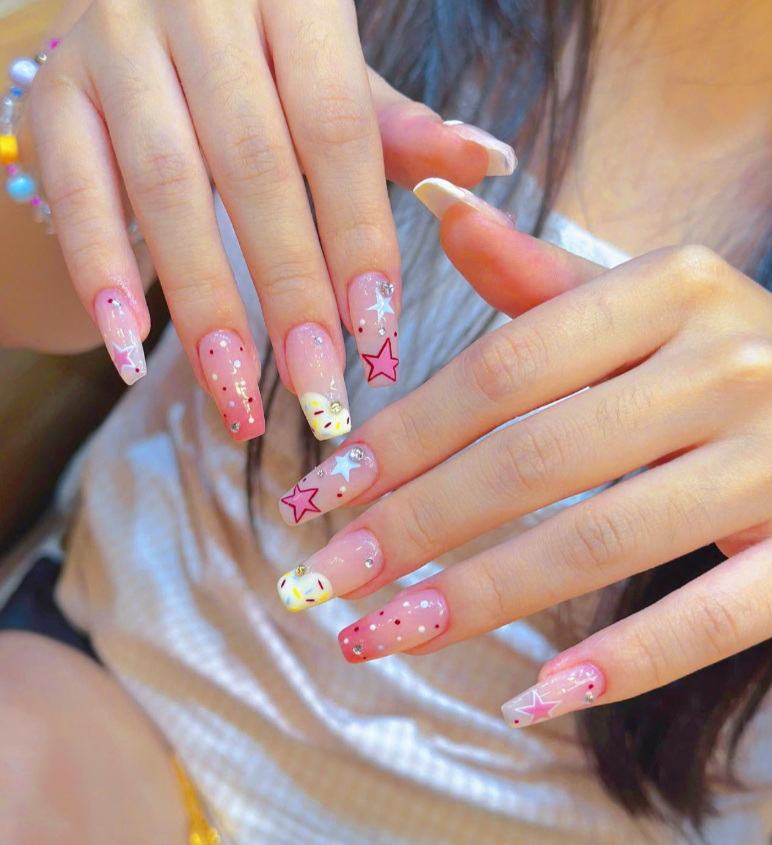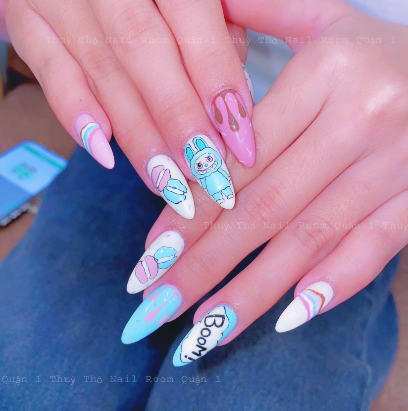 • Charm thủ công: Thay vì sử dụng charm nhựa có sẵn, Thùy Thỏ Nail có thể tạo hình các biểu tượng theo yêu cầu như vỏ sò, ngôi sao biển. Thậm chí là các nhân vật hoạt hình theo phong cách tối giản.