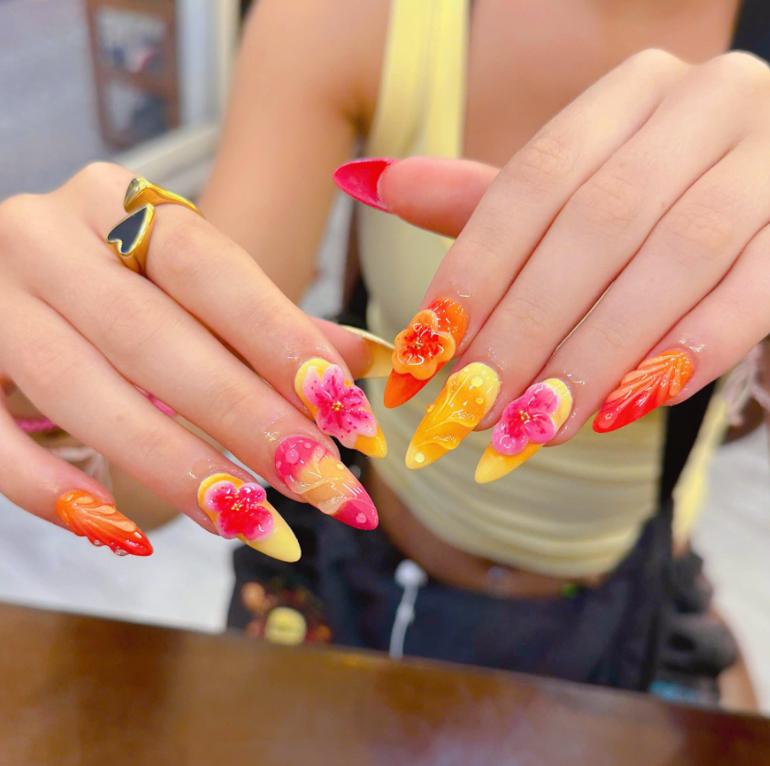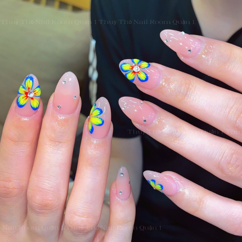 Sự kết hợp hoàn hảo với kỹ thuật “giọt nước” giúp cánh hoa trông mọng nước và sống động như thật. Bộ móng này mang lại cảm giác tươi mát, tràn đầy nhựa sống, vô cùng phù hợp để bạn diện cùng những bộ váy maxi hay những bộ bikini rực rỡ trên bãi biển Đà Nẵng.