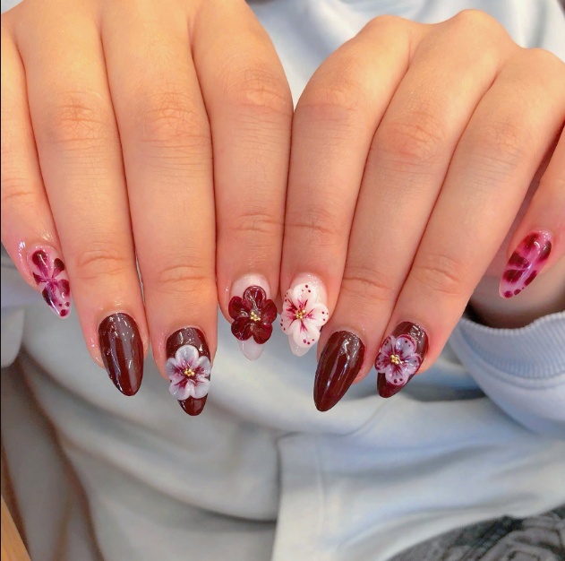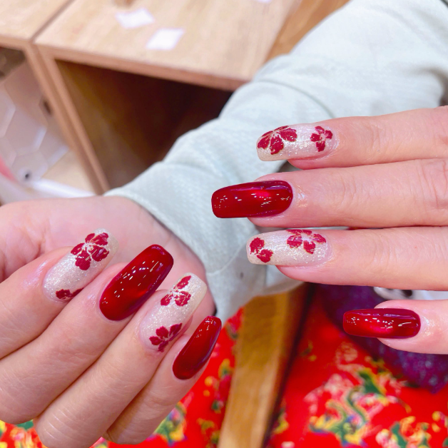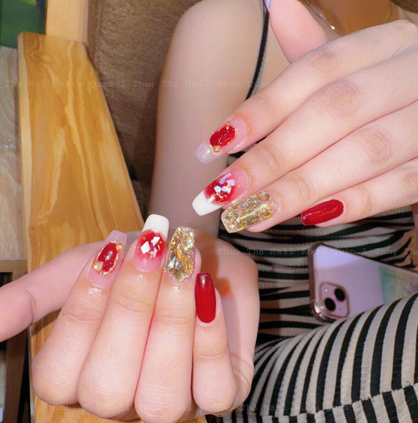 Đỉnh cao của sự sang trọng chính là những đóa hoa được đắp gel nổi 3D một cách sống động. Những cánh hoa đỏ rực rỡ vươn mình trên mặt móng. Không chỉ tạo hiệu ứng thị giác mạnh mẽ. Mà còn thể hiện đẳng cấp của người sở hữu. Đây là mẫu nail luôn “cháy hàng” tại cả hai cơ sở của Thùy Thỏ mỗi dịp Tết.
